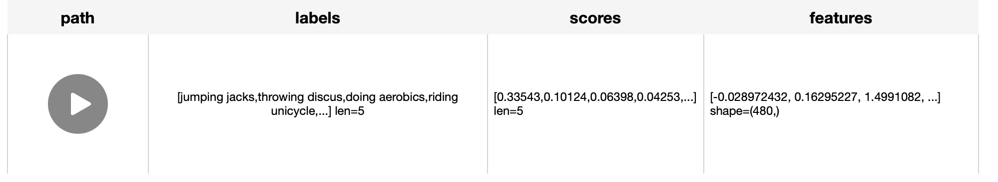 A video classification operator generates labels (and corresponding scores) and extracts features for the input video. It transforms the video into frames and loads pre-trained models by model names. This operator has implemented pre-trained models from MoViNet and maps vectors with labels provided by datasets used for pre-training.