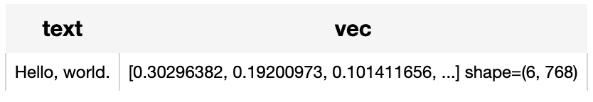## Code Example Use the pre-trained model 'distilbert-base-cased' to generate a text embedding for the sentence "Hello, world.". *Write the pipeline*: ```python import towhee ( towhee.dc(["Hello, world."]) .text_embedding.transformers(model_name="distilbert-base-cased") ) ``` *Write a same pipeline with explicit inputs/outputs name specifications:* ```python import towhee ( towhee.dc['text'](["Hello, world."]) .text_embedding.transformers['text', 'vec'](model_name="distilbert-base-cased") .show() ) ```